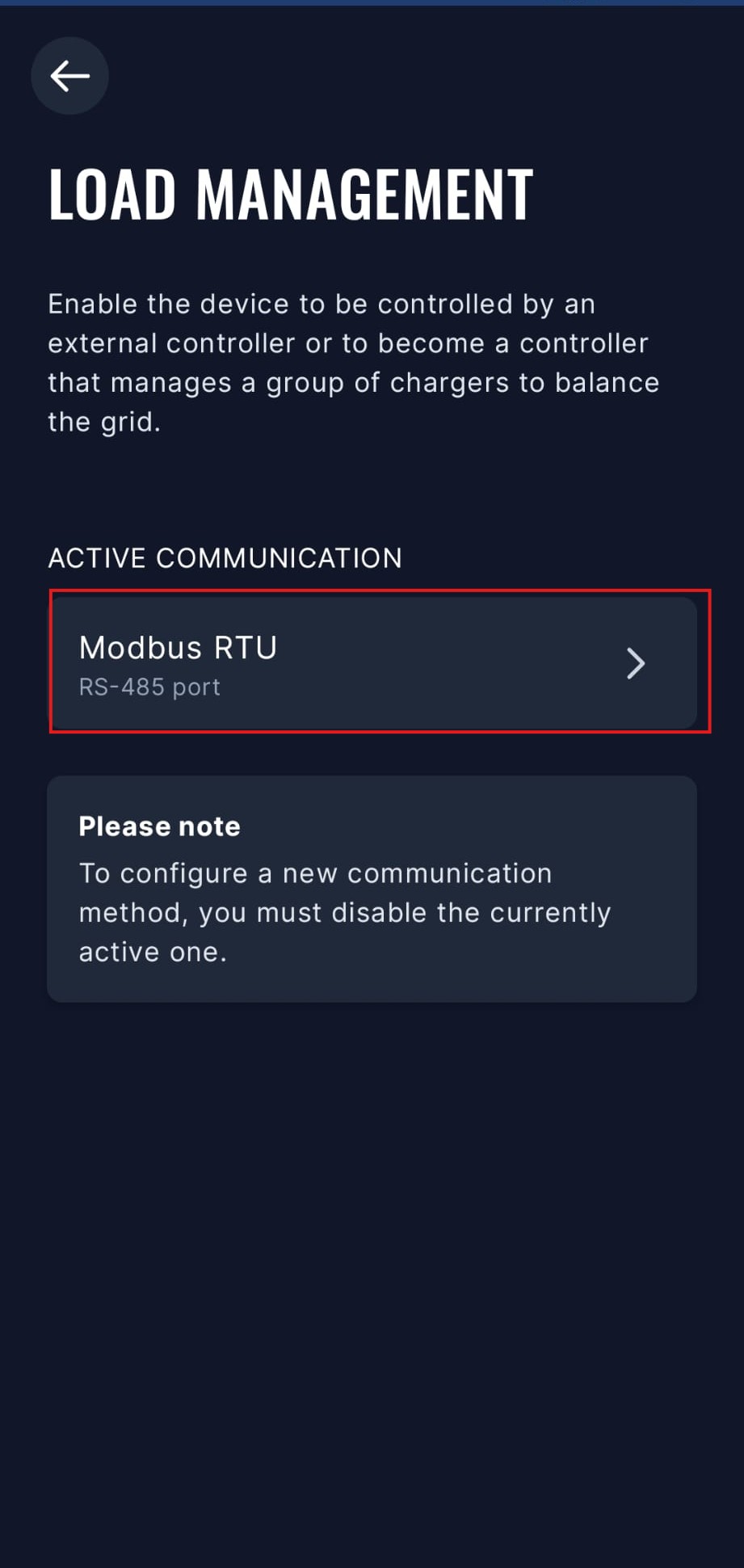 - The SmartgridOne Controller will now be able to communicate with the TeltoCharge via Modbus RTU. You can check the connection status in the app.